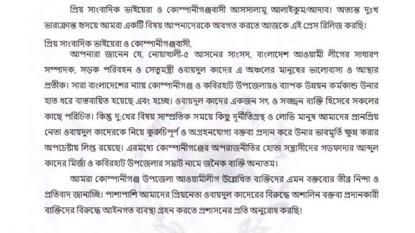 নোয়াখালী প্রতিনিধি বাংলাদেশ আ’লীগের সাধারণ সম্পাদক এবং সড়ক পরিবহন ও সেতুন্ত্রী ওবায়দুল কাদেরকে নিয়ে ফেসবুকে (নোবিপ্রবি) কর্মকর্তা জিয়াউল হক সম্রাটের কটূক্তির প্রতিবাদে নোয়াখালীর কবিরহাটে বিক্ষোভ মিছিল ও প্রতিবাদ সভা অনুষ্ঠিত ......বিস্তারিত
